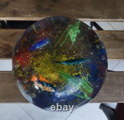 This hand-blown glass paperweight features a unique and colorful design inspired by Murano fish sea coral. Made with glossy finish glass, this vintage piece is handmade with a production style of art glass. The multicolored coral pattern adds a decorative touch to any space, making it a beautiful and original addition to any collection.