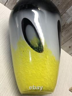 MCM Vtg Murano Style Hand Blown Glass Vase 11 Black & Yellow 1970s FREE SHIP