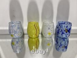 Crafted from glass using a unique art glass production style and technique, these glasses are a beautiful and original addition to your home bar collection. Made by the renowned brand Murano, these handmade glasses showcase the intricate Millefiori design that is both timeless and modern. One still has a sticker and the others do not.